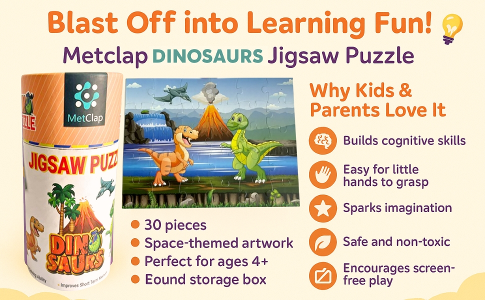 138 reviews for Metclap Dinosaurs Jigsaw Puzzle – 30‑Piece Fun & Educational Learning Game for Kids | Colorful Prehistoric Adventure in Round Box