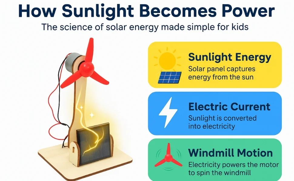 Hands-On STEM Learning β By assembling parts, connecting wires, and watching the windmill spin, children understand how solar energy works.